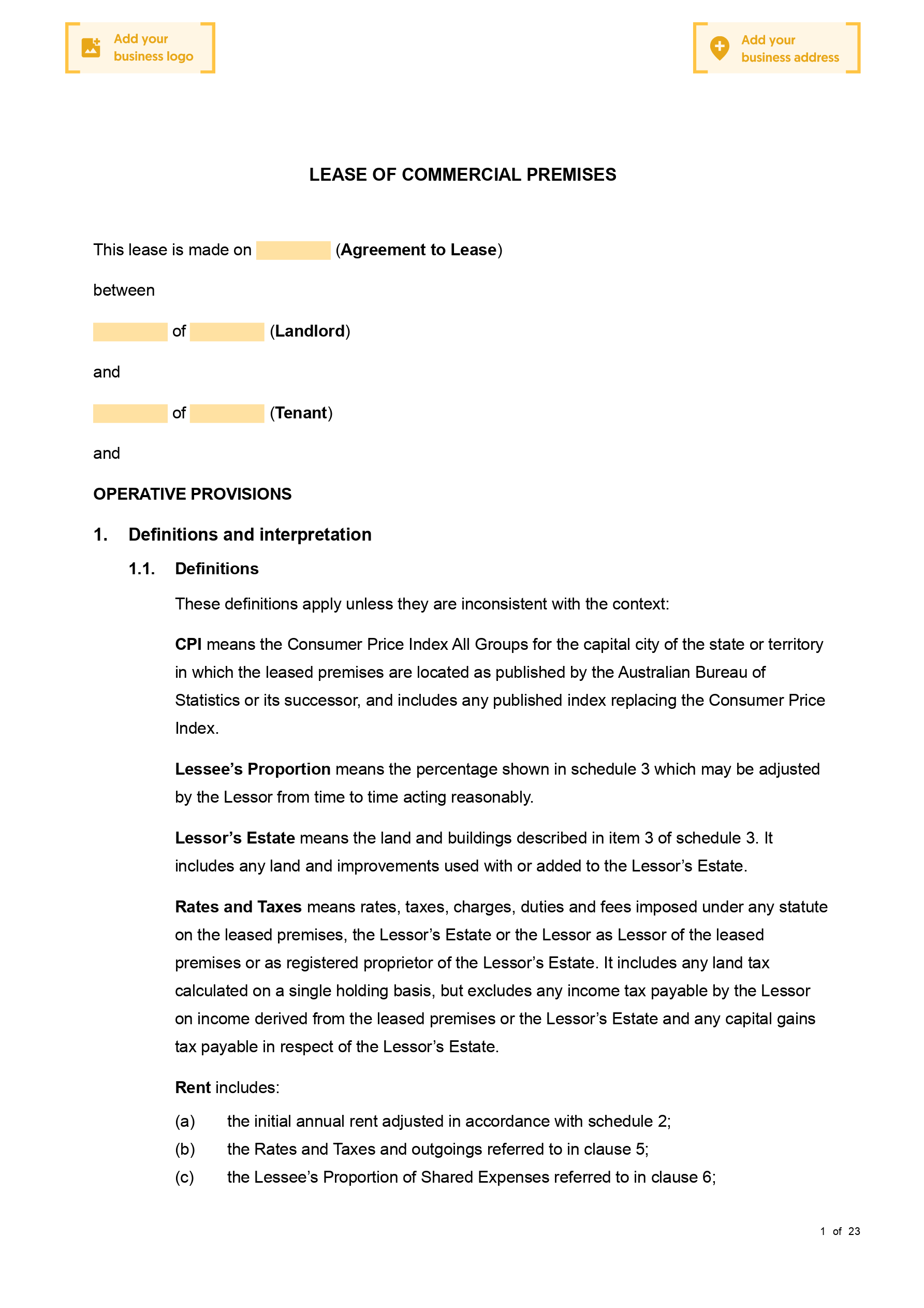 You MUST seek advice from a qualified professional before using this lease to check that it meets your specific circumstances. A Commercial Lease Agreement (General) (VIC) is a legal document that can be used when a commercial property is being rented from a landlord (lessor) to a tenant (lessee). This document will create a legal relationship between the landlord and tenant; and will allow the parties to the agreement to outline the terms, rights and legal obligations of both the landlord and tenant under the lease.