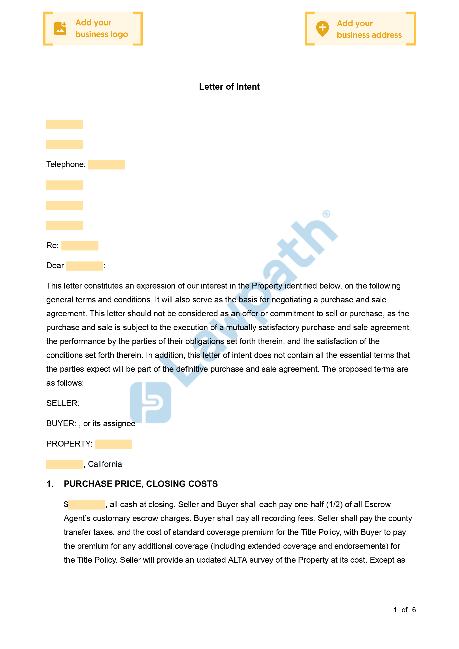 A letter of intent is essentially a document that declares the preliminary commitment of each party to do business with one another. The document outlines the key terms of a prospective commercial deal (for this document, the purchase and sale of a property). The letter of intent is not intended to include all of the terms of the purchase and sale transaction, but should include enough material terms so that the parties have some assurance that they will ultimately be able to arrive at a deal.