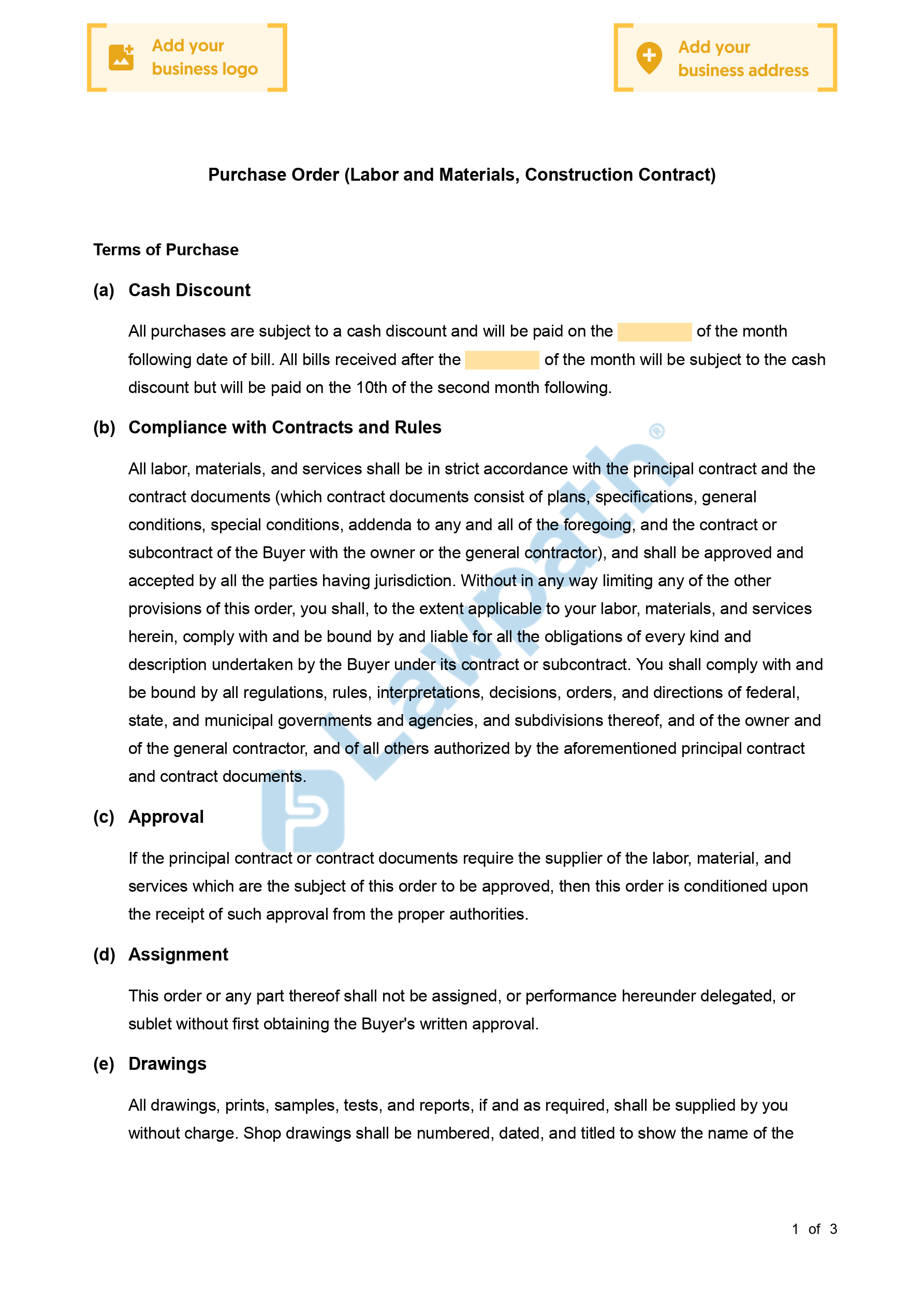 This Purchase Order can be used by a buyer and contain terms and conditions upon which it will acquire from a supplier labor and materials, in the context of a construction contract.Document Overview