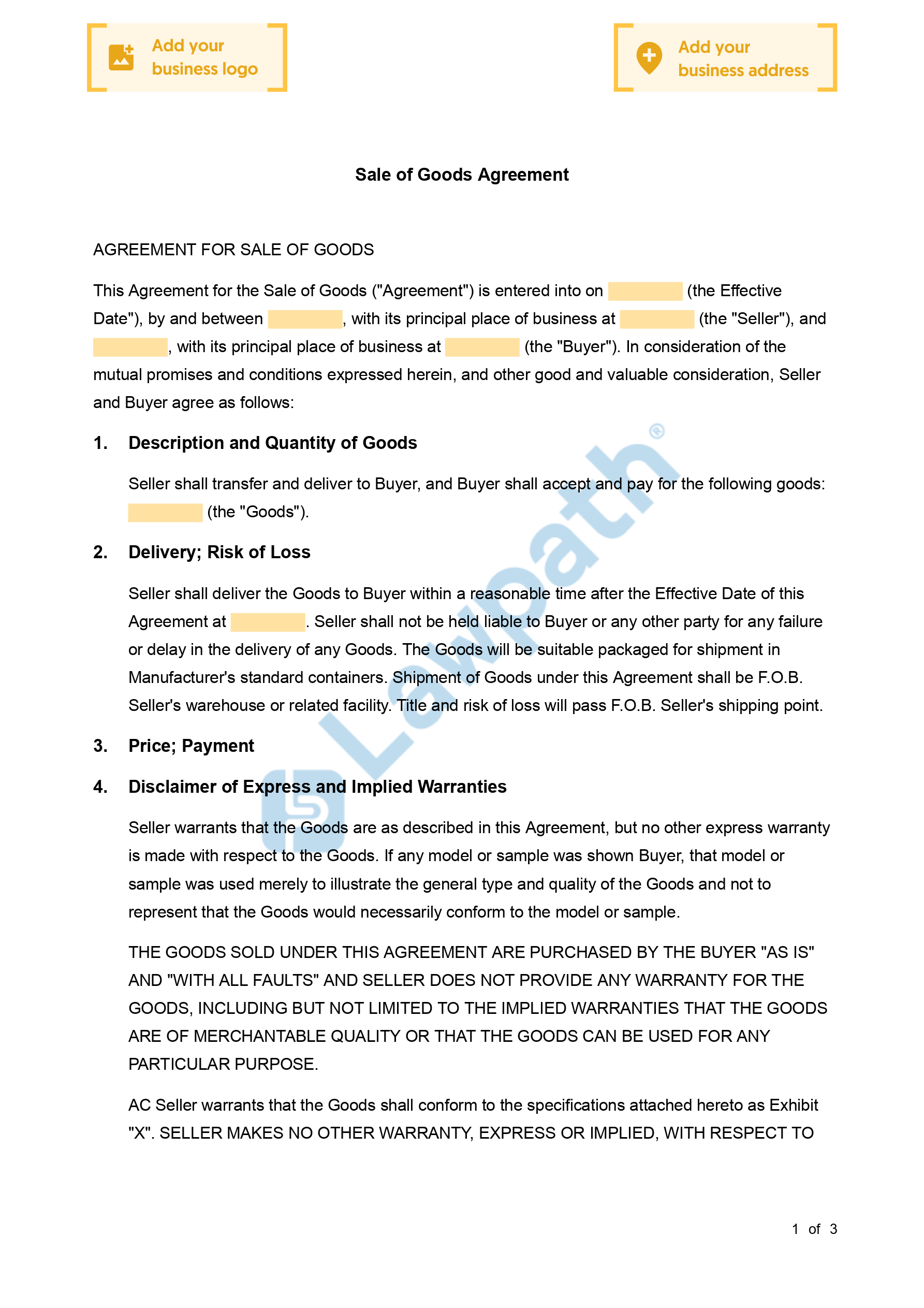 This Sale of Goods agreement includes basic terms and conditions for the parties' sale and purchase of goods. Please seek legal advice if you wish to add additional seller protections to this agreement such as terms addressing intellectual property rights, inspection and acceptance and assignment.